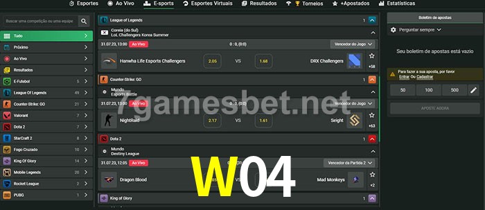 O W04 oferece uma grande seleção de opções de apostas em e-sports com probabilidades competitivas